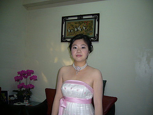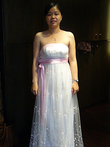 本來昨天還在想是要選澎裙還是窄版的禮服,但今天試了大約六件禮服後,就覺得還是窄版的禮服好了,澎裙穿去公證似乎有些誇張,挑來挑去,屬意二件: